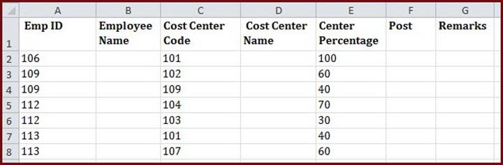 2. Prepare a relevant excel sheet with the following columns structure: Emp. Id’, ‘Name’, ‘Cost Center Code’, ‘Cost Center Name’ & ‘Cost Center Percentage’. A user may also insert the following columns; if needed: ‘Post’ & ‘Remarks’. Afterwards, you may specify the value of the ‘Post’ column; either with value (1) for posting or (0) for not posting.