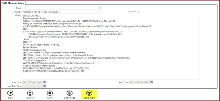 To send SMS notifications, navigate to My Daily Work à System Setup à General Admin & Security à SMS Message Setup.